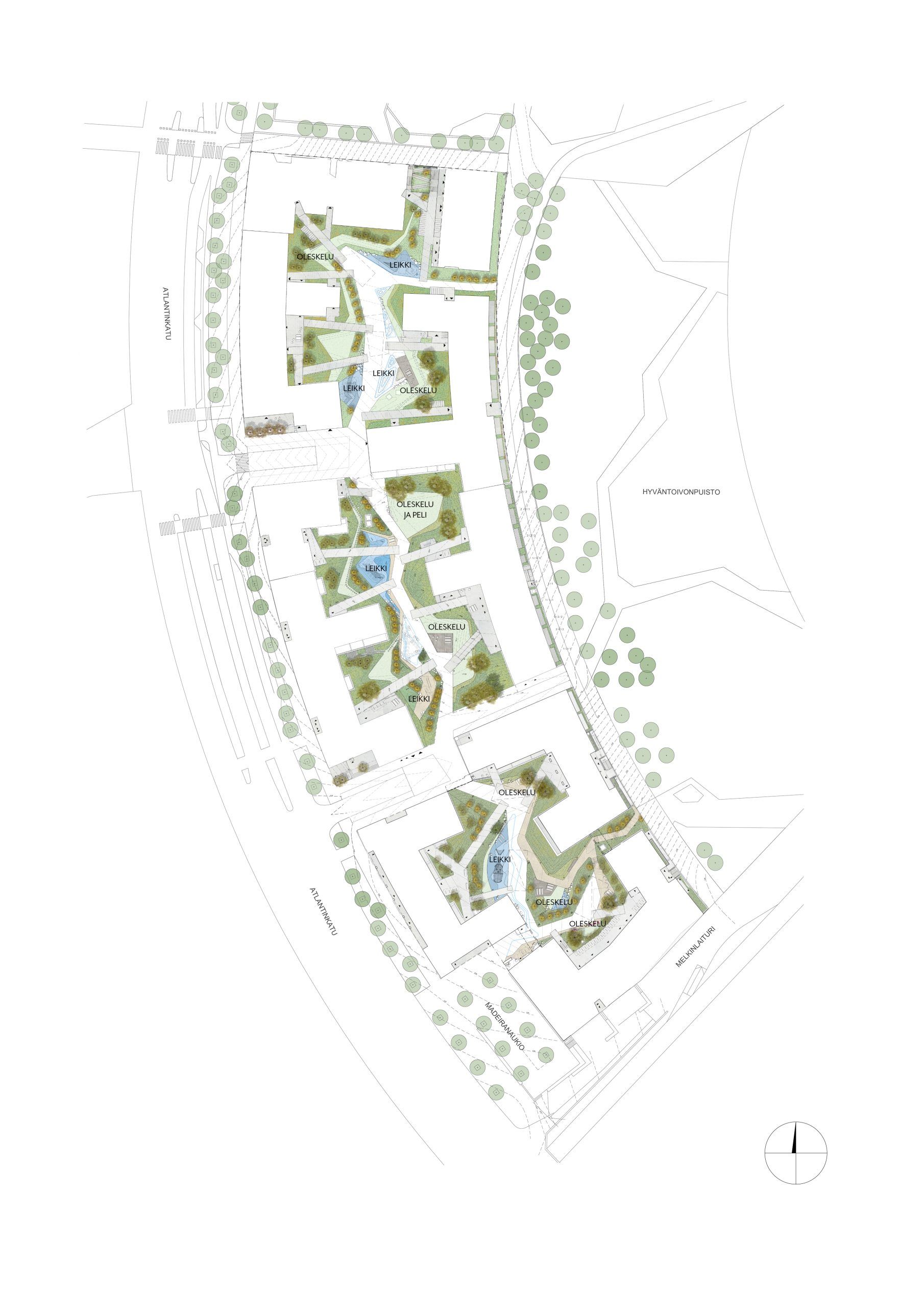 Suunnitelman tilallisena periaatteena on korttelikokonaisuuden läpi kulkeva uomaansa muovaava pääreitti, ”virtaava vesi”. Pääreitti on pihan kokoava aihe ja perustaso, ja se hahmottuu kortteleiden keskellä vapaana tilana. Pääreitti toimii myös pihan tulvareittinä. Uoma levenee pihatiloissa ”suvannoiksi”, joissa liike hidastuu ja muodostaa oleskelun ja leikin paikkoja. Virran suvantokohtiin sijoittuu puutasoja, kalusteita ja varusteita. Pääreitiltä kohti rakennusten julkisivuja ja sisäänkäyntejä maasto nousee pihan perustasoa korkeammalle muodostaen ”rantatörmiä”, joille on sijoitettu yksityisemmät piha-alueet. Piha-alueilta on kevyenliikenteen yhteyksiä viereiseen Hyväntoivonpuistoon.