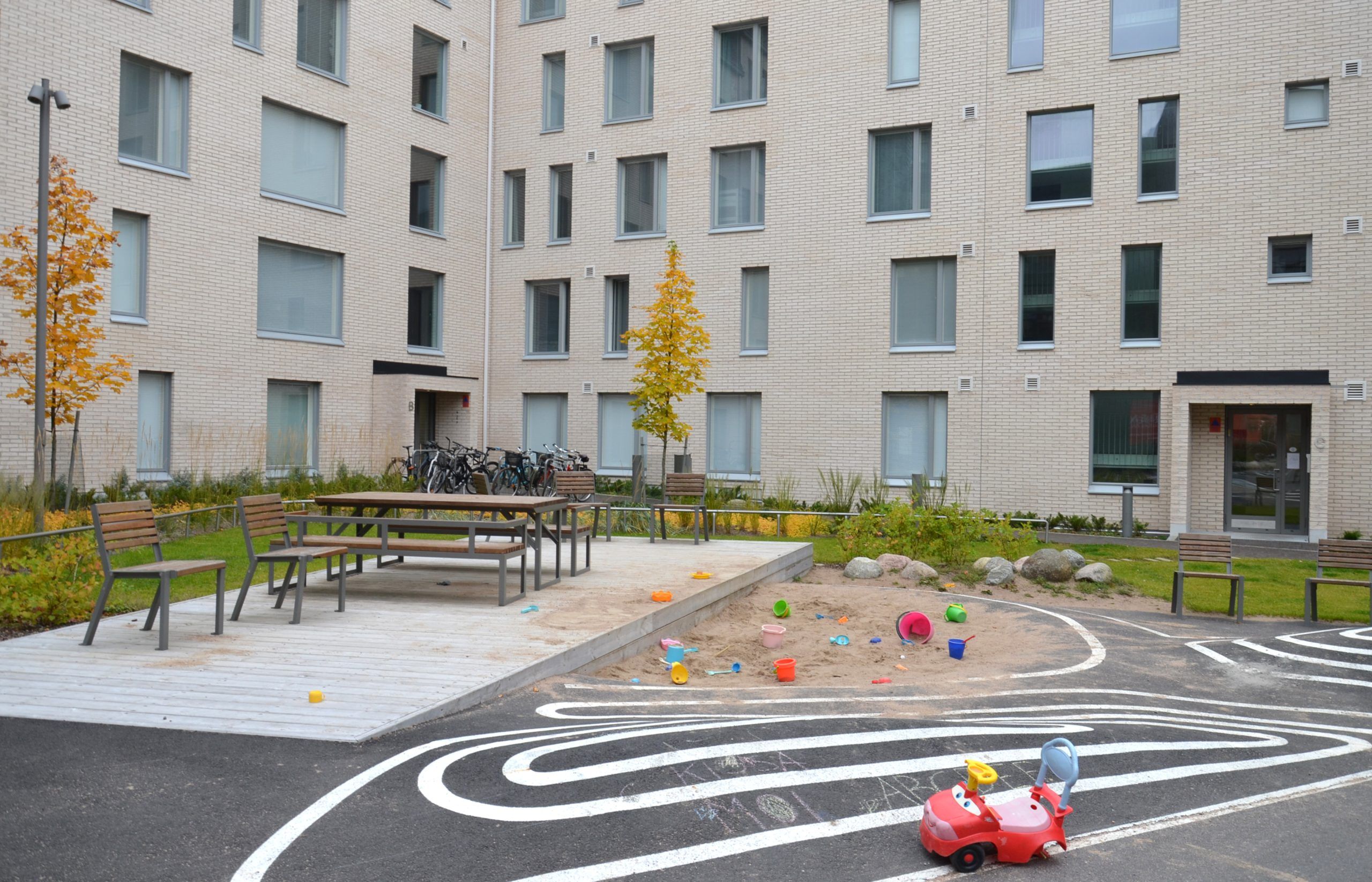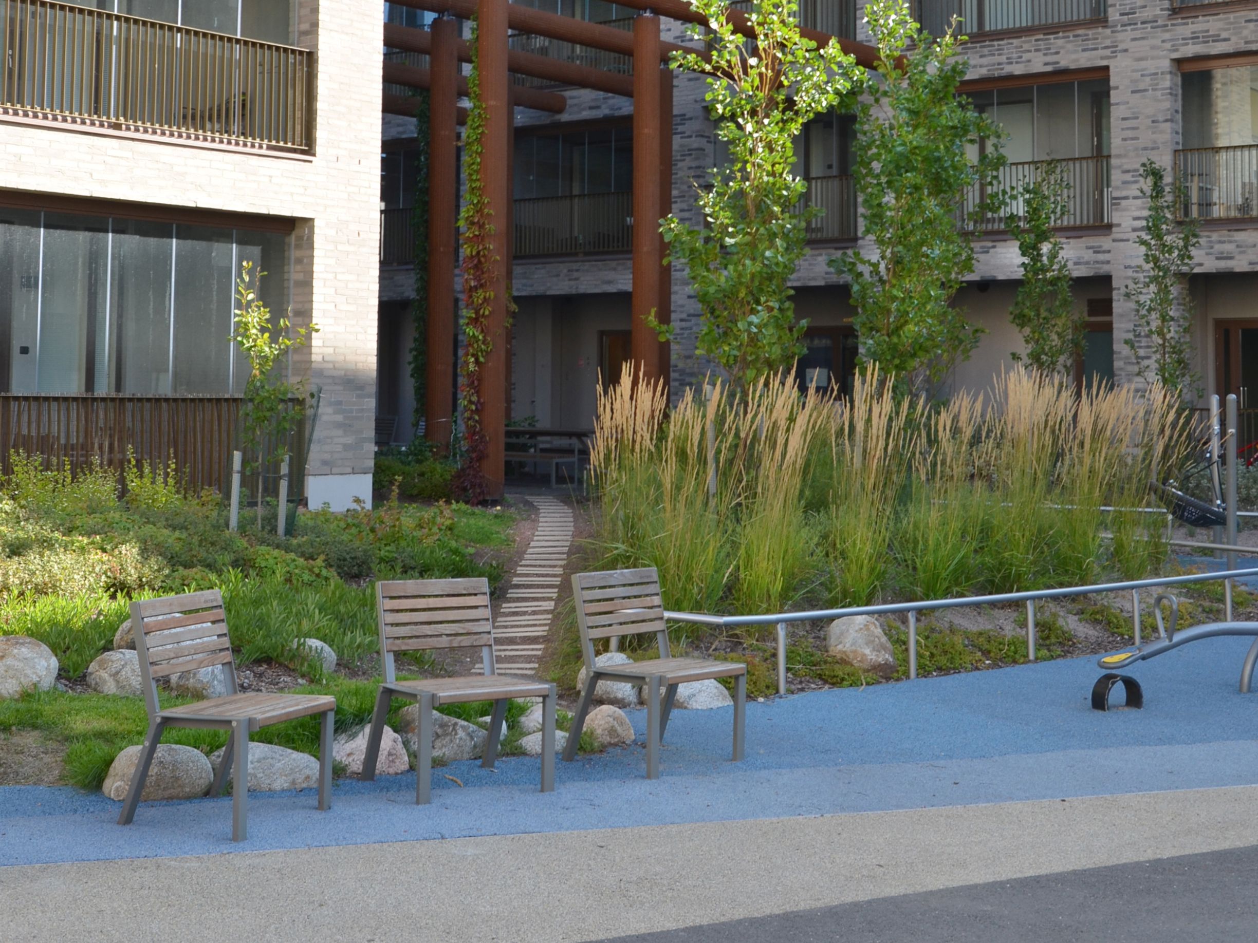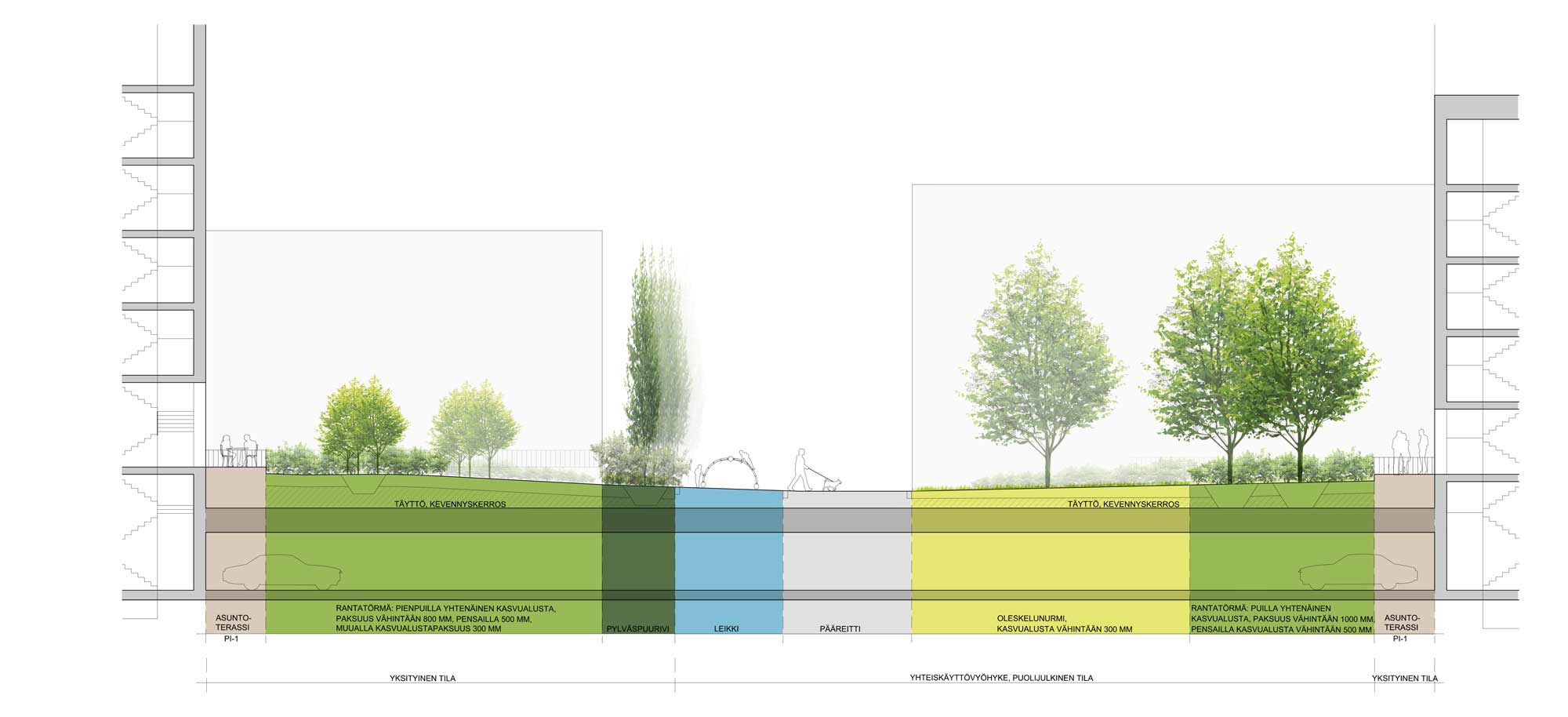 Korttelia yhdistävän pihavyöhykkeen tavoitteena on monipuolistaa oleskelun ja leikin mahdollisuuksia sallimalla toimintojen vaihtelevuus tonteittain. Pihavyöhyke tarjoaa erilaisia oleskelu- ja leikkialueita pihareitin varrelle, ja vyöhykkeen elävyyttä lisäävät maantasokerrosten reitille avautuvat asuntoterassit sekä liike- ja asukastilat.