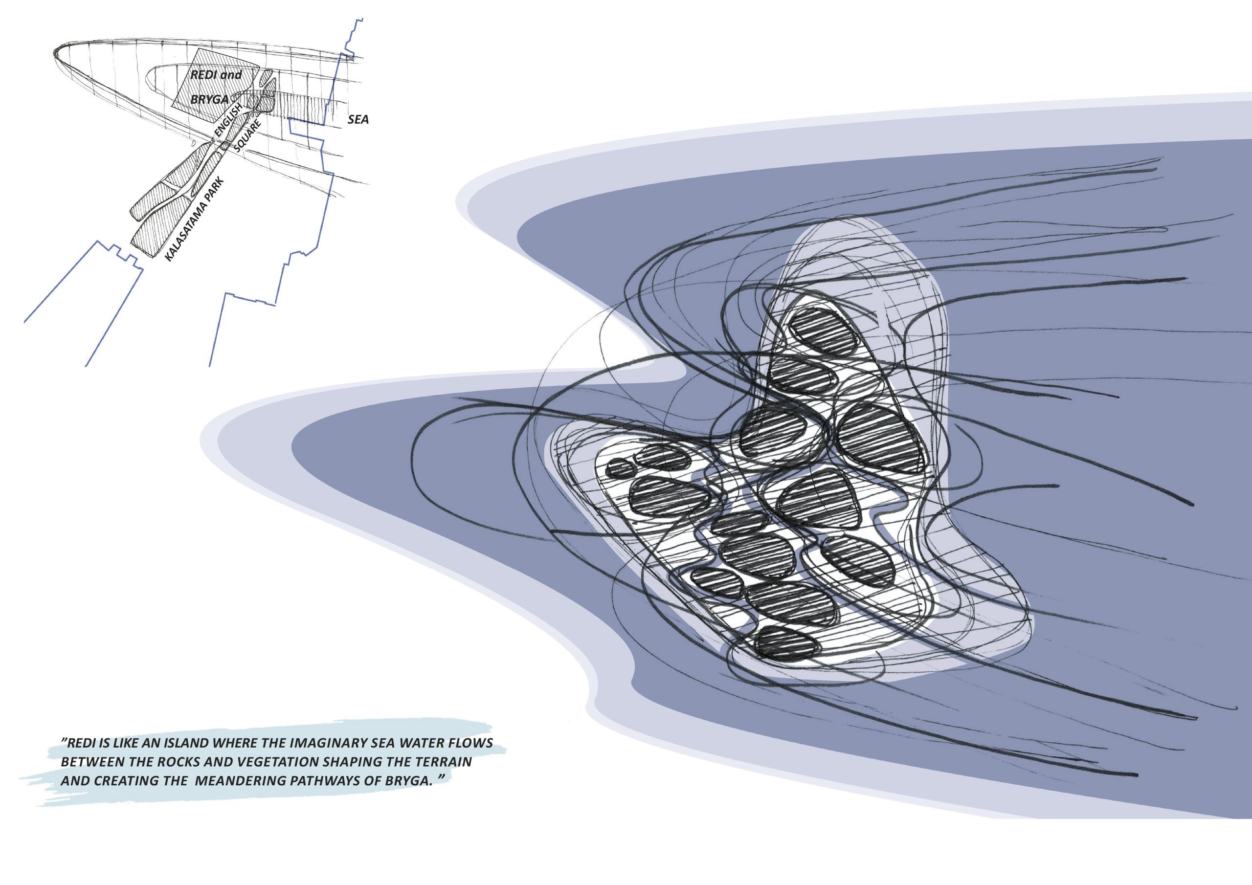 Bryga on osa Kalasataman keskeisten ulkotilojen sarjaa. Sen pääteema on heijastaa Kalasataman menneisyyttä saaristona ja teollisena satamaympäristönä ja luoda maisema-arkkitehtuurin ja taiteen keinoin kaupunginosalle tunnistettava identiteetti. Ulkotilojen suunnittelun kokonaisidean mukaisesti Redi on kuin saari, jonka rantoja meren aallot huuhtovat, puistokannen ja pihojen tasolle yltävät vain veden kuvitteelliset pärskeet. Ajatuksen tasolla vesi virtaa saaren kallionkoloissa, kivien ja kasvillisuusmättäiden väleissä hakien luontevimman reittinsä maastoa muovaten. Ulkotilojen tilallinen jäsentely sekä kulkuväylien, materiaalien ja kasvillisuuden muotoilu perustuvat tähän saaristoteemaan.