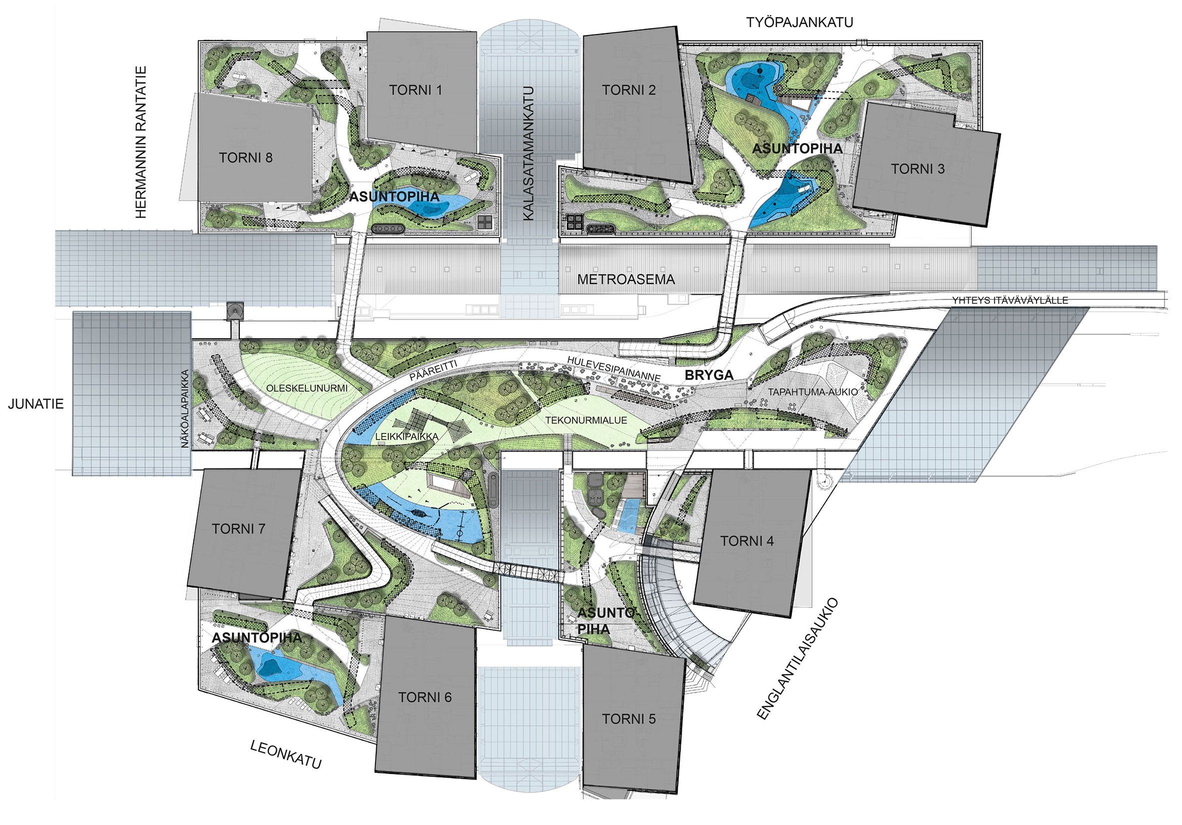 Puistokansi Bryga ja kahdeksan tornitalon yhteyteen rakennettavat pihat muodostavat poikkeuksellisen laajan kannelle rakennetun ulkotilakokonaisuuden. Kohde sijaitsee Helsingin Kalasatamassa, kauppakeskus Redin katolla ja Junatien päällä ympäröiviä katualueita 20–25 metriä korkeammalla.
