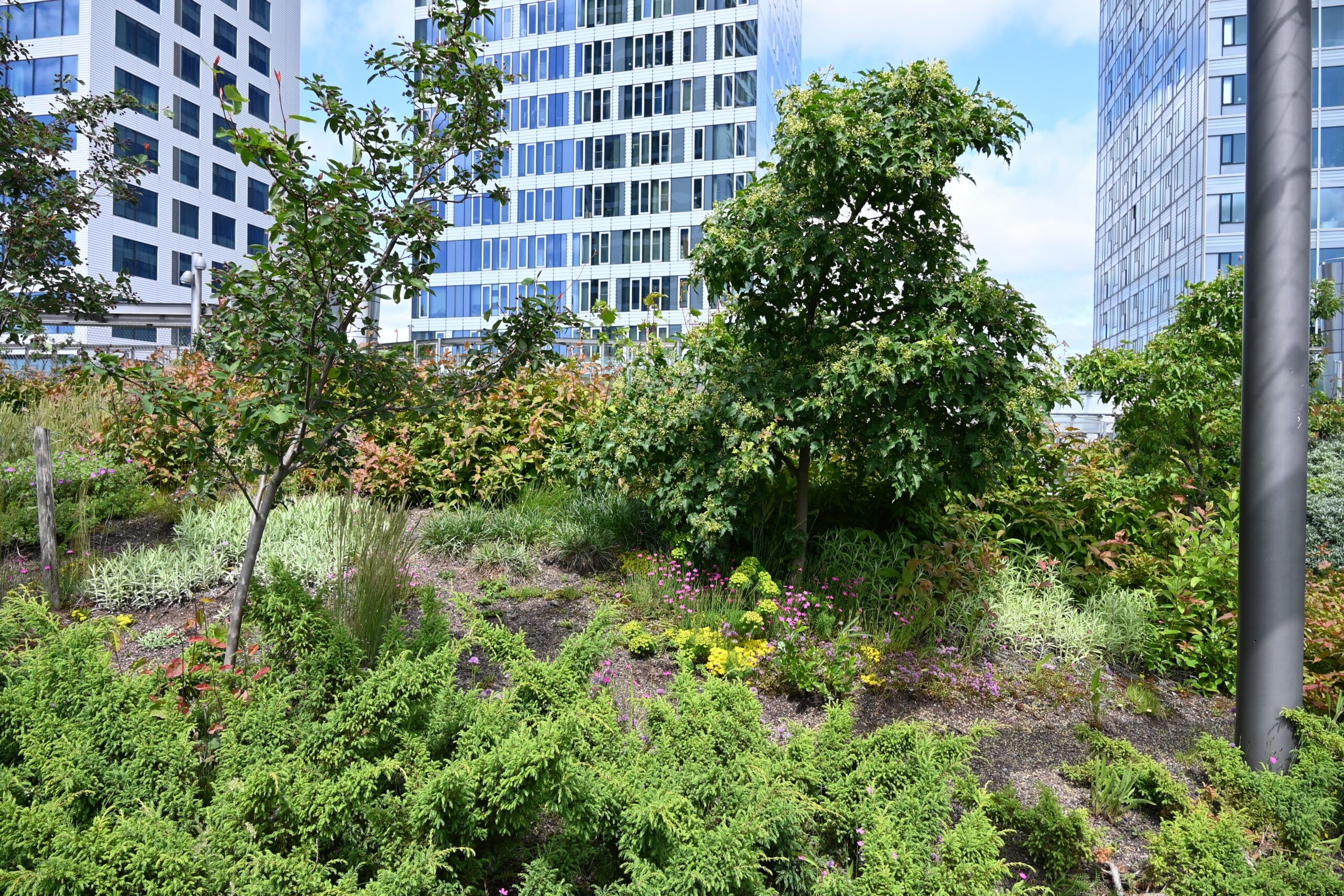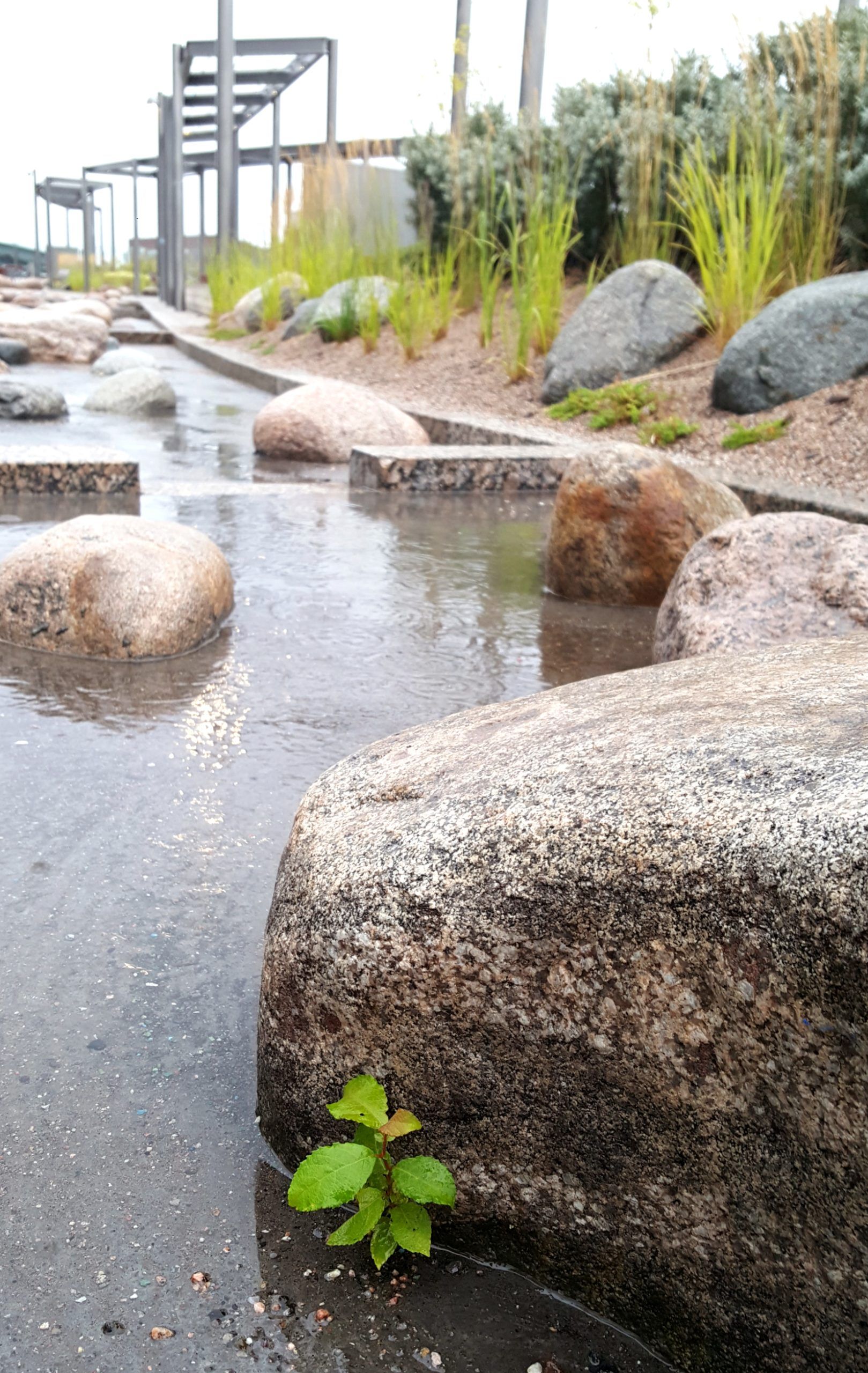 Laajat, istutetut maastokummut nousevat tasaisesta peruspinnasta saarekkeina, jotka jaksottavat puisto- ja pihatiloja. Kasvillisuuspeitteiset kummut toimivat akustoivina ja hulevesiä imeyttävinä pintoina, luovat miellyttävää mikroilmastoa ja lisäävät paikan ekologista monimuotoisuutta. Pääreitit ovat osa peruspintaa ja niiden varrelle asettuvat leikin ja oleskelun paikat. Tuulisuutta vaimentavat ja toimintoja reunustavat köynnöspergolarakenteet jaksottavat puisto- ja pihatiloja. Niihin on integroitu valaistusta ja kannelle nousevaa tekniikkaa. Puistokansi Bryga ja piha-alueet muodostavat Redin viidennen julkisivun.