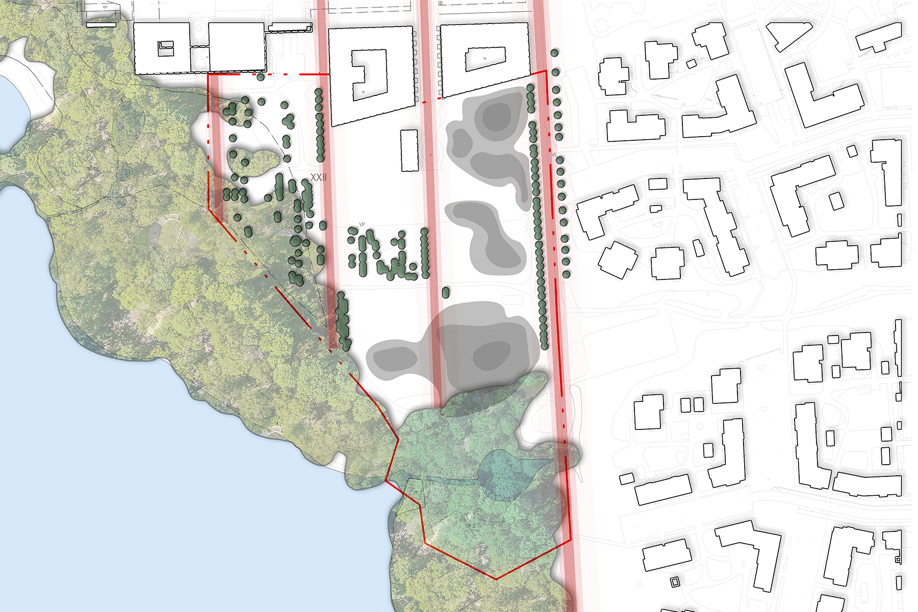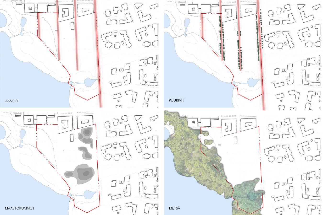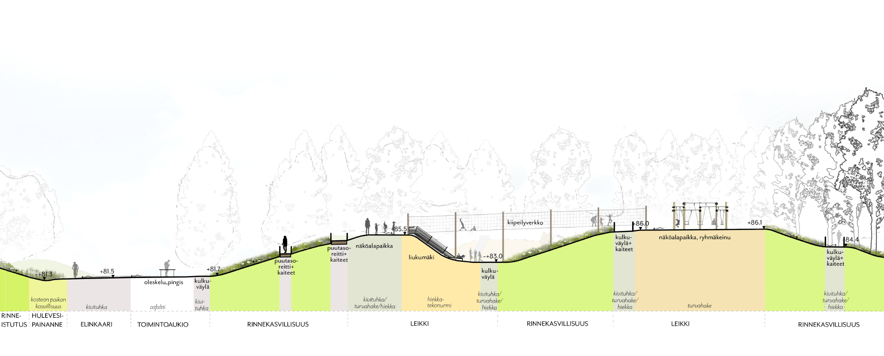 Puistosuunnitelma pohjautuu eri osa-alueiden ominaispiirteiden vahvistamiseen. Pääosin ylijäämämassoista rakennetut maastokummut kiertyvät peli- ja oleskelunurmen ympärille, muodostavat suojaavan selustan istuskelunurmille ja ohjaavat katsetta otollisiin suuntiin sekä mahdollistavat elämyksellisen leikkipaikan. Maastonmuotoilua korostetaan varjopuolen runsaalla ja monipuolisella kasvillisuudella.
