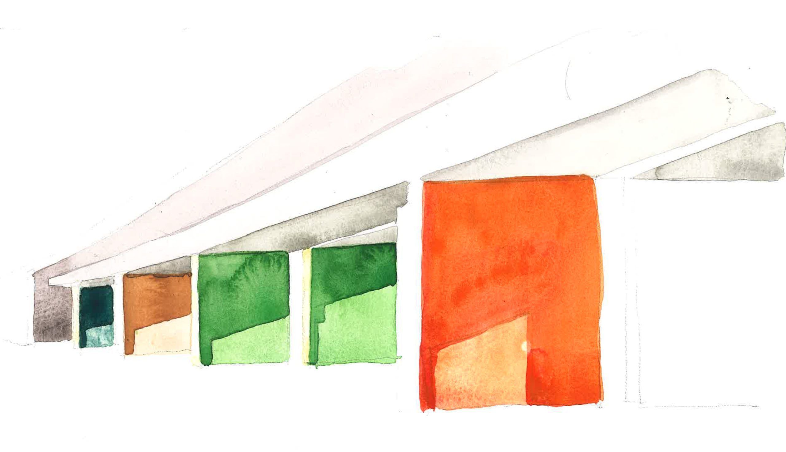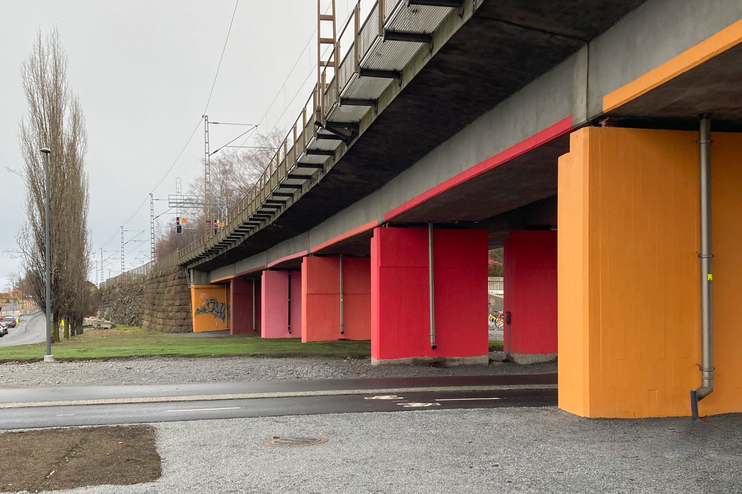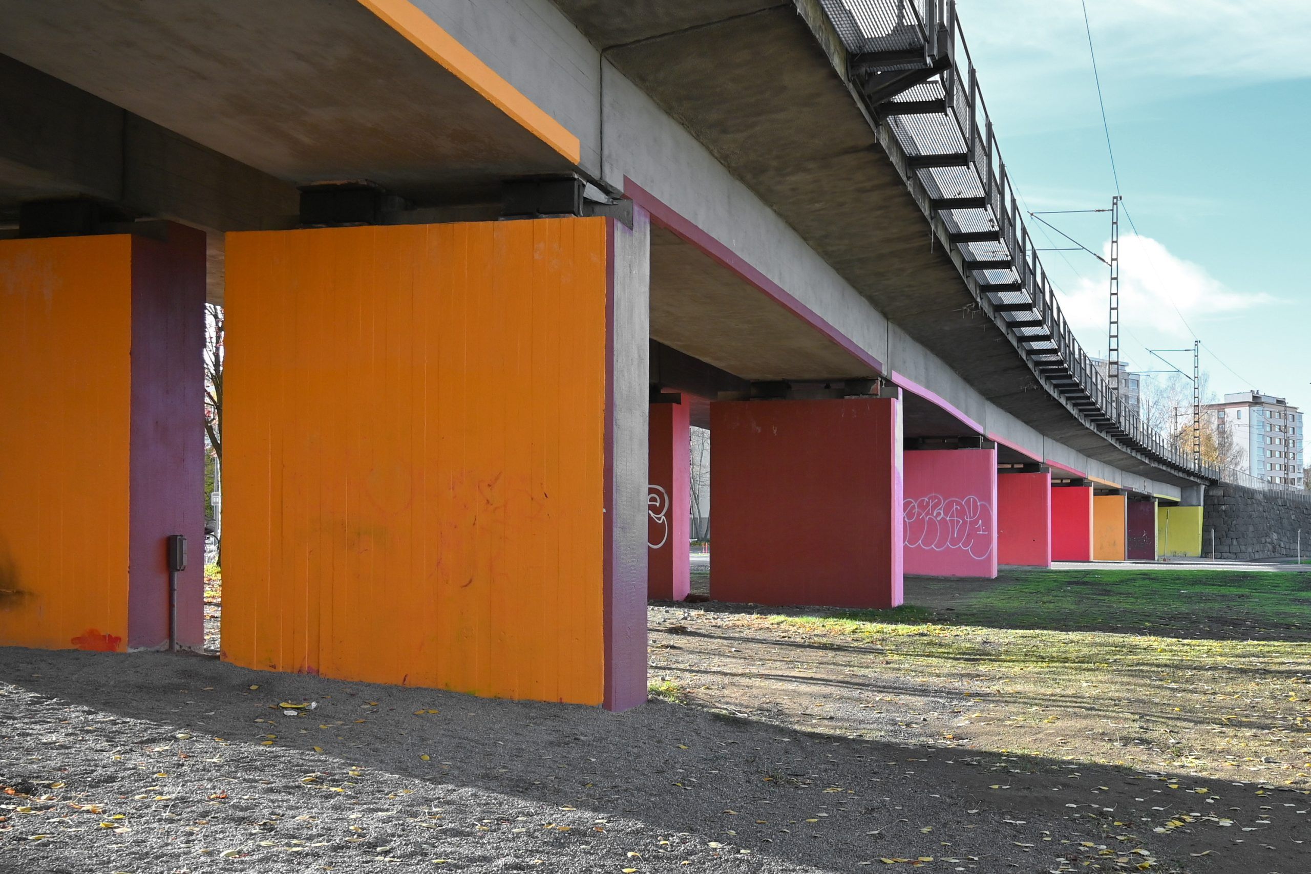 Sillan pilarit maalattiin keltaisen, oranssin ja punaisen sävyisillä betonimaaleilla. Punertava sävymaailma luo kontrastin harmaalle betonipinnalle. Valitsimme värisävyt huolellisesti siten, että niistä muodostuu kauniita, inspiroivia värisiirtymiä ja sävykokonaisuus soi kauniisti yhteen. Sillan alle muodostuu junavaunuja, joissa kussakin on oma värinsä. Väripaletissa on käytetty soveltuvin osin Tampereen kaupungin brändivärejä. Sillan pilarien sävymaailma jatkuu aukion kasvillisuudessa ja kalustuksessa.
