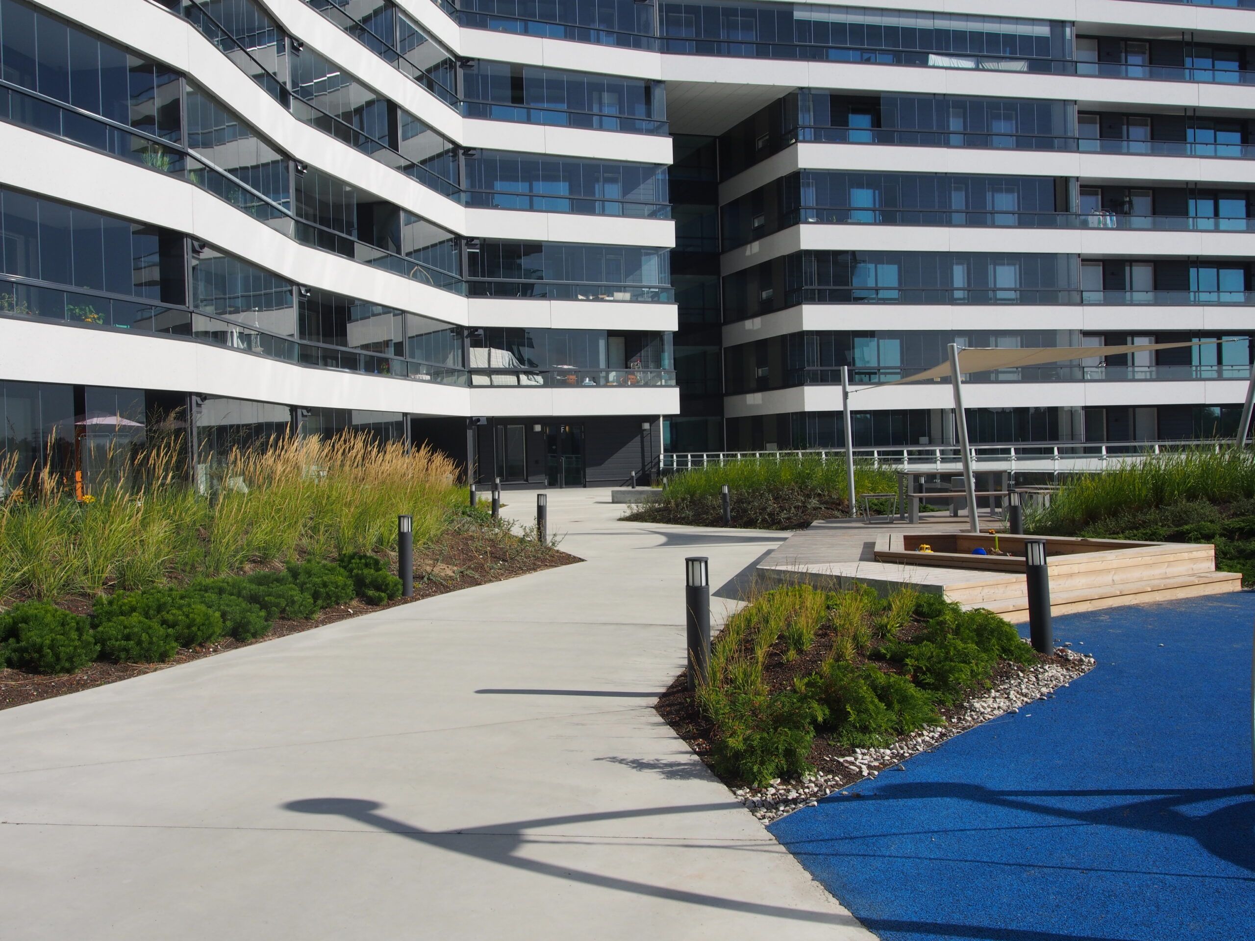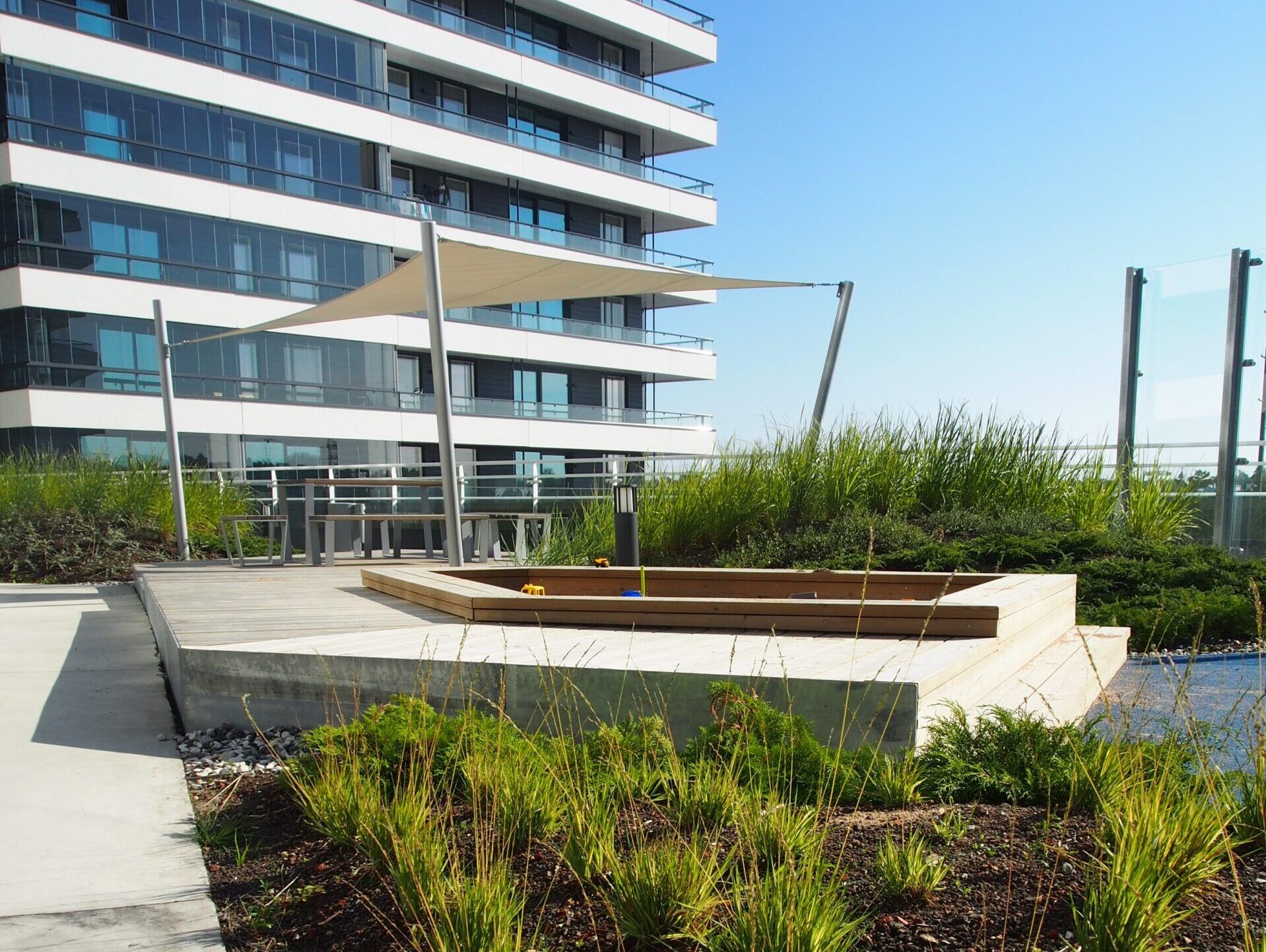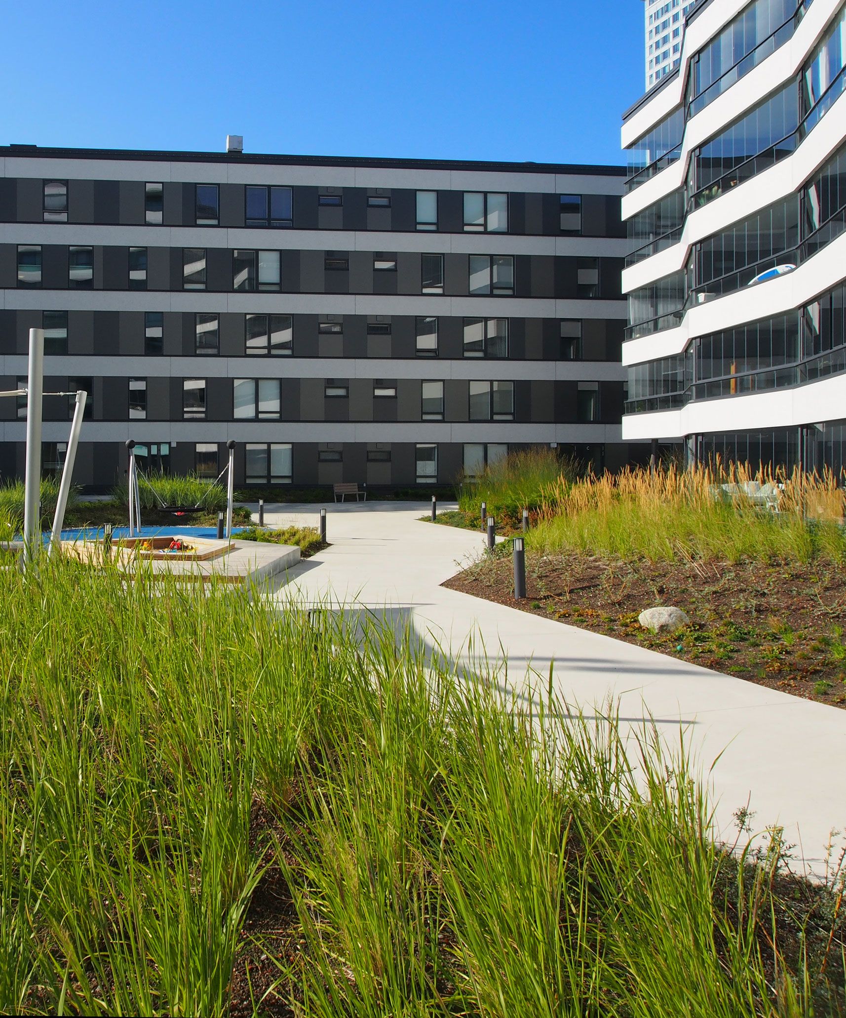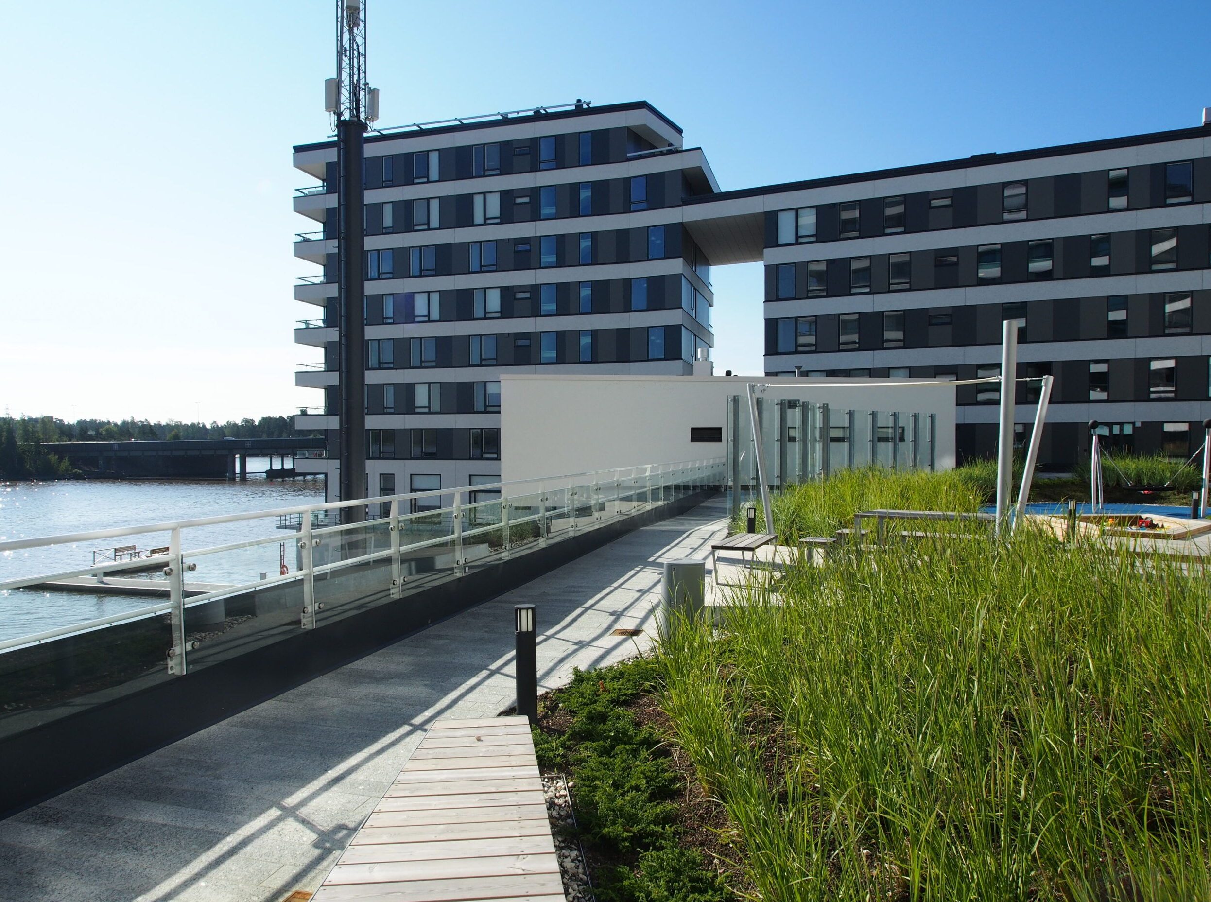 Tontin hulevesien käsittely on vaatinut paljon yhteensovitustyötä suunnitteluvaiheessa. Kaikki asuinrakennusten katot ovat hyvin loivia viherkattoja. Kansipihalla hulevedet ohjataan maanpinnan kallistuksilla istutusalueille kasvillisuuden käyttöön. Koko kannen alueelle on asennettu hulevesien keräyskennostot, joilla hulevesiä viivytetään kasvillisuuden käyttöön. Pihan tulvareitit ohjataan hallitusti mereen ja kansirakenne on muotoiltu suppilomaiseksi rakenteeksi, joka kerää ylimääräiset vedet hulevesiverkostoon.