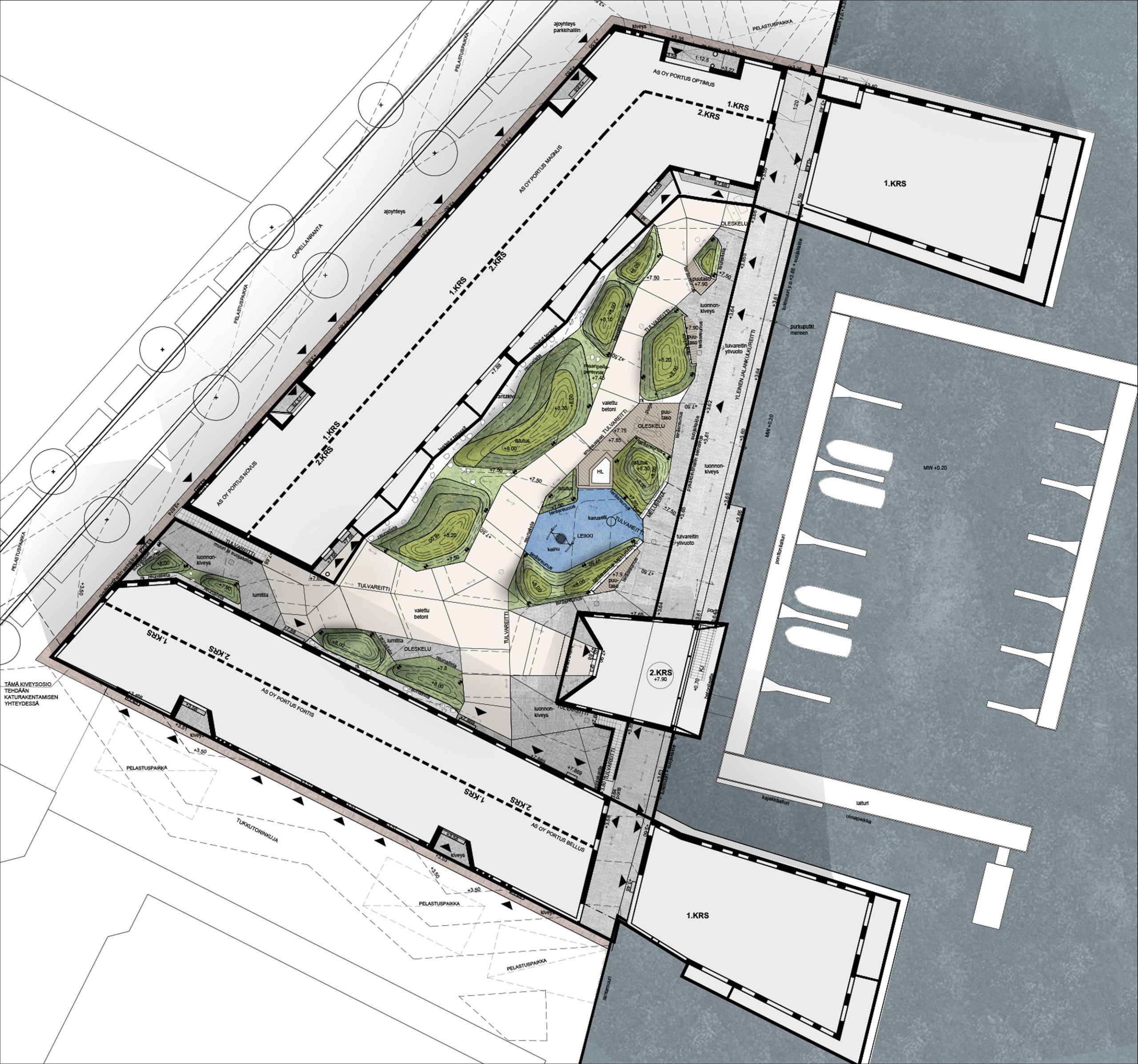 Pihan muotokieli toistaa suurista laivoista inspiraationsa saaneiden rakennusten julkisivujen rytmiä. Piha henkii merellistä tunnelmaa, joka on luotu saaristoluontoon viittaavan kasvillisuuden, luonnonkivien, purjekatoksen ja puutasojen avulla. Kannen tasolla olevien asuntoterassien edustalle on luotu suojavyöhykkeitä istutettujen maastokumpujen avulla. Koko pihan kasvillisuudessa on käytetty merenrannoille tyypillistä kasvillisuutta, kuten tyrniä, katajia ja ketoneilikkaa. Istutuksia on täydennetty merelliseen tunnelmaan ja ankariin olosuhteisiin sopivilla pensailla, perennoilla ja heinillä. Pihatoiminnot on jäsennelty istutussaarekkeiden lomaan. Pihalla on sekä yhteisölliseen toimintaa kutsuvia pöytäryhmiä ja leikkipaikka että rauhallisia istuskelupaikkoja vetäytymiselle. Suunnittelussa on huomioitu haastavat ilmasto- ja meluolosuhteet eri toimintojen ja lasikaiteiden sijoittelussa.