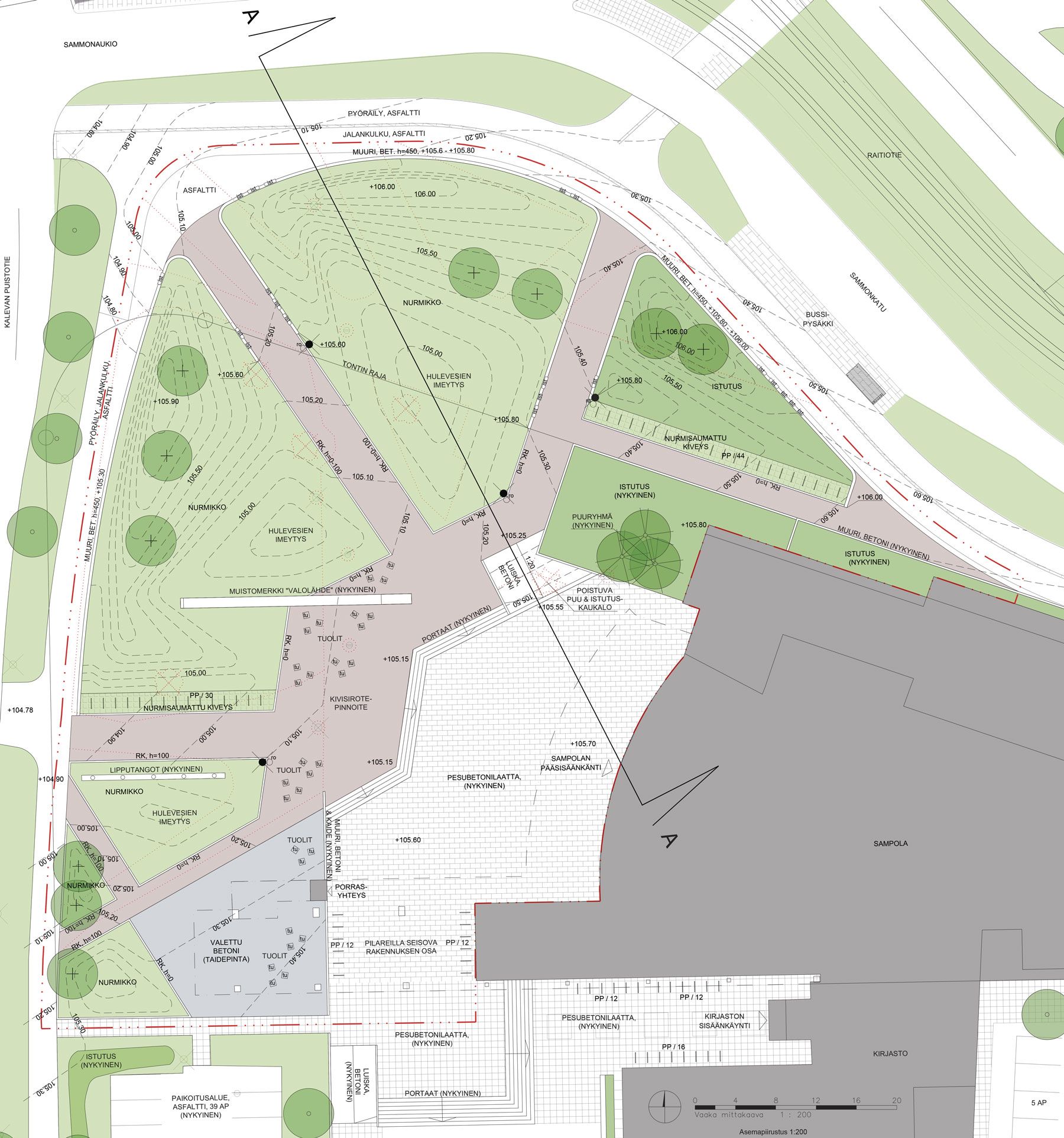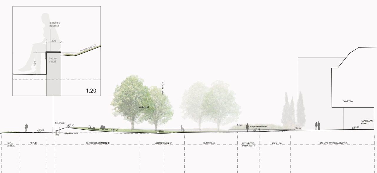 Paikallavaletut betonimuurit rajaavat aukion vilkkaasta katutilasta ja tärkeistä jalankulun ja pyöräilyn reiteistä, jolloin aukion ja pihan muodostama kokonaisuus saa rauhallisemman luonteen. Korotettujen nurmialueiden hienovarainen muotoilu luo selustan liikenneympäristölle. Istutusten jaksotuksessa on huomioitu laajat kaupunkitilojen väliset näkymäyhteydet. Harkitut uudet puuistutukset ohjaavat näkymiä ja yhdistävät Sampolan kaupunkitilan Kalevan kirkon laajaan maisemaan. Alueen pintavedet on ohjattu nurmialueiden loiviin imeytyspainanteisiin, joissa rakennekerrokset on suunniteltu tarkoituksenmukaisesti viivyttäviksi.