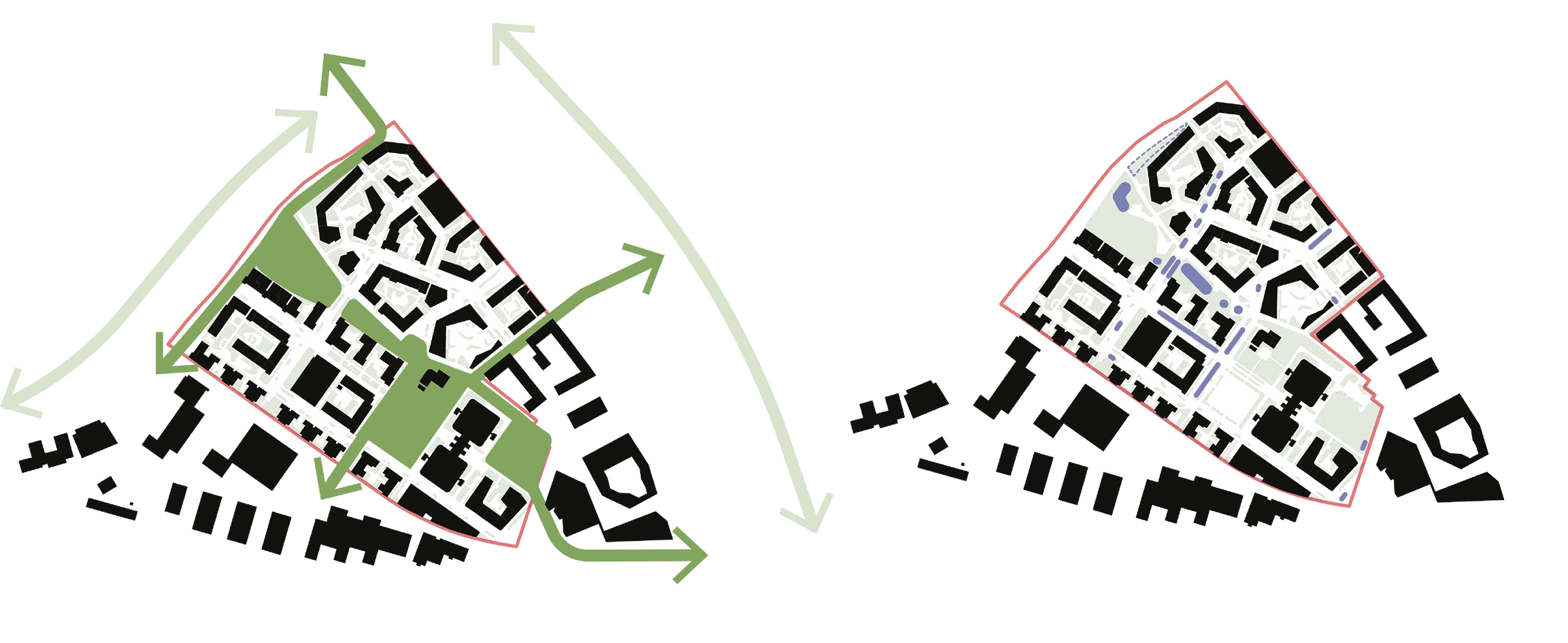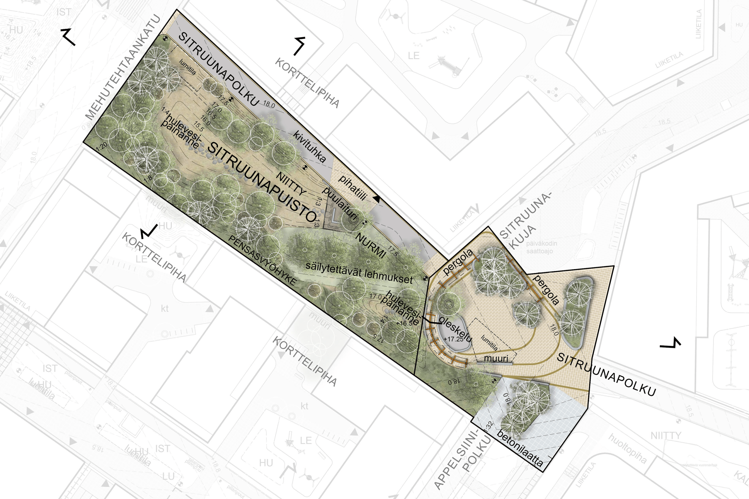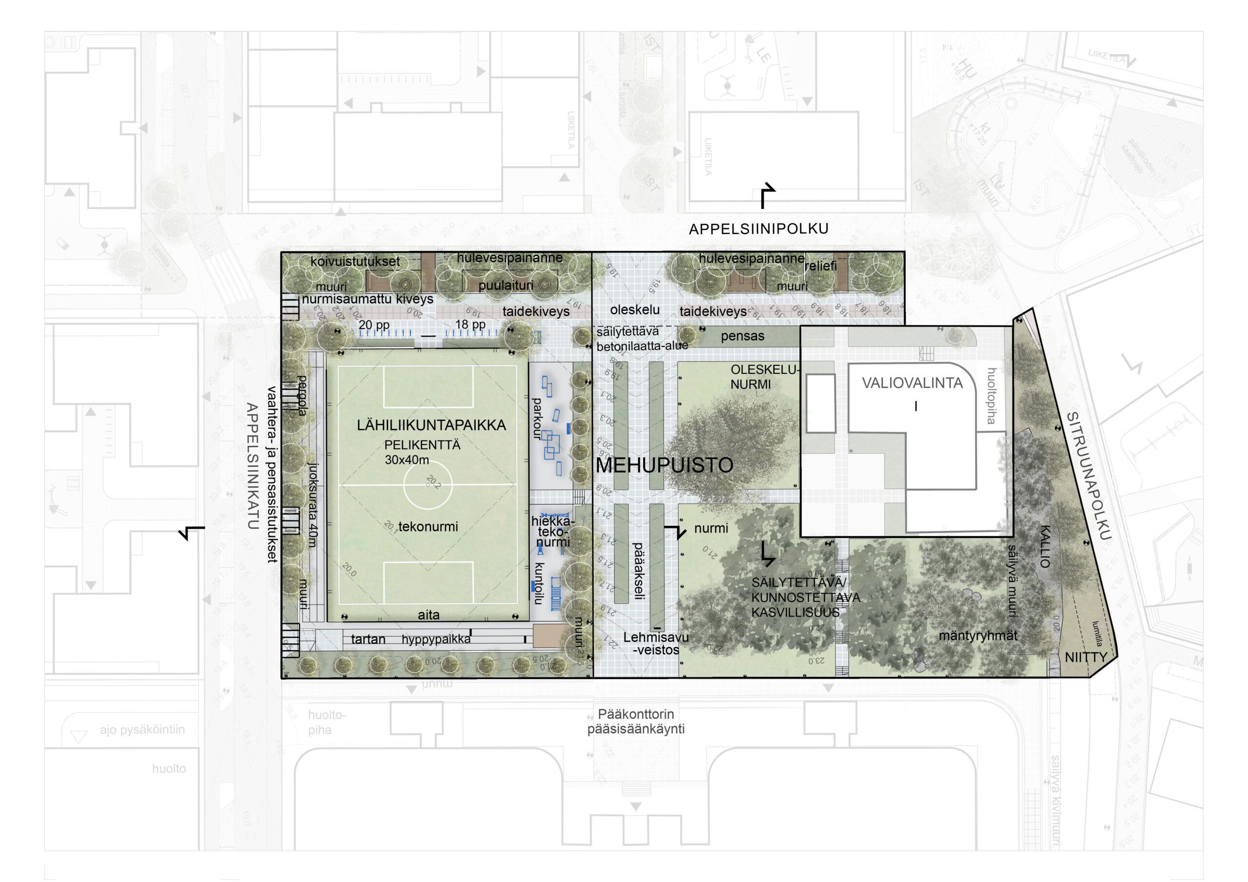 Valion suunnitelman sydämenä toimii vehreä puistoketju, joka pohjautuu alueen kahteen säilytettävään metsikköön ja oleviin katupuihin. Puistovyöhyke kokoaa yhteen alueella syntyvät hulevedet, isokokoisen puuston, oleskelualueet sekä liikunta- ja leikkipaikat. Julkiset puistot muodostavat alueelle vehreän tilasarjan, joka sijaitsee alueen keskellä ja yhdistää kaksi säilytettävää metsäaluetta. Viheralueet linkittyvät ekologisilta ominaisuuksiltaan ympäröiviin viheryhteyksiin ja niiden piirteet kurottavat myös korttelipihoille. Valion suojeltava päärakennus ja sen ympäristön säilytettävät viheralueet liittyvät hienovaraisesti osaksi ympäristön modernimpaa ilmettä, luoden paikalle omaleimaisen ja tunnistettavan ilmeen.