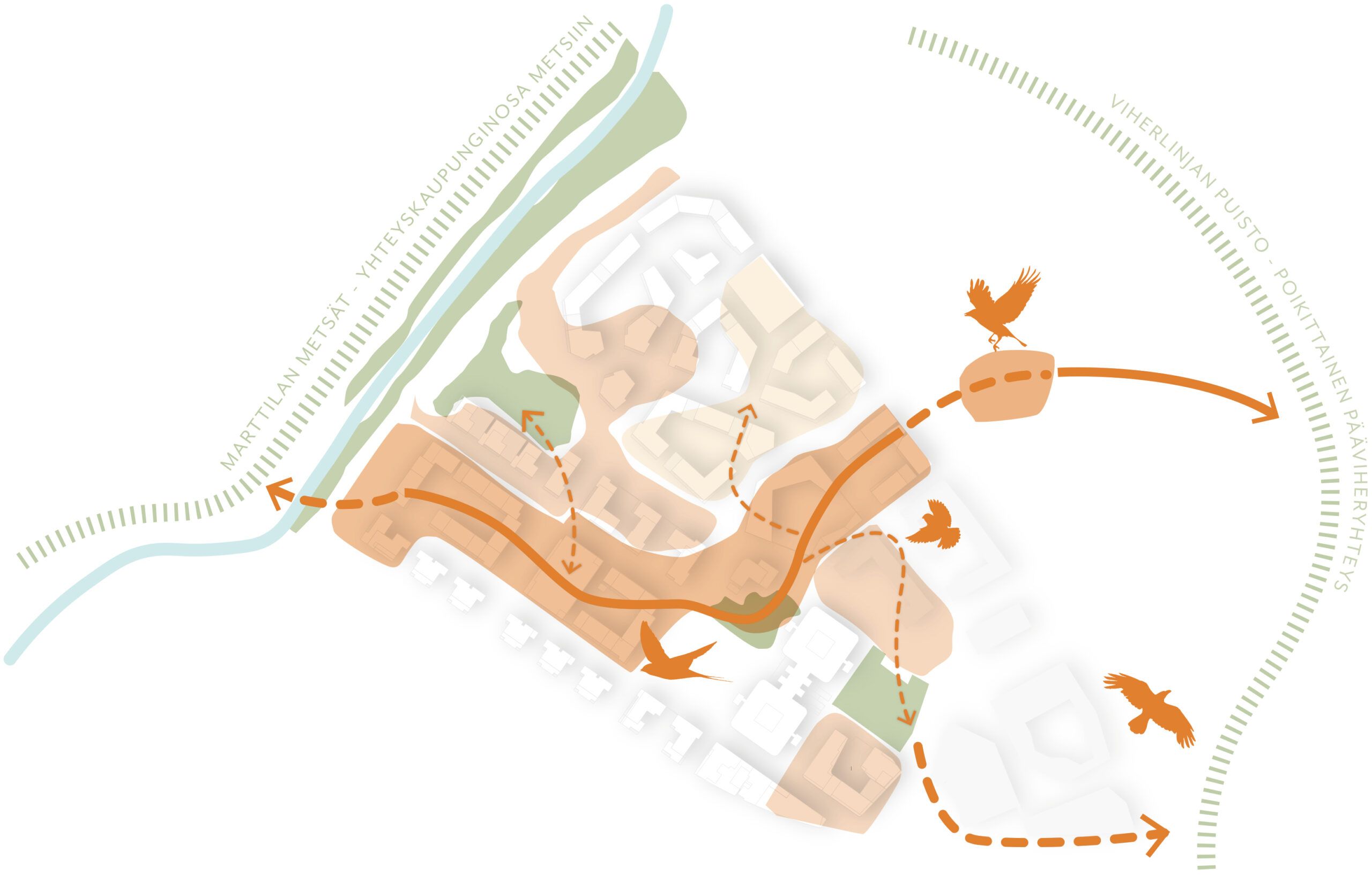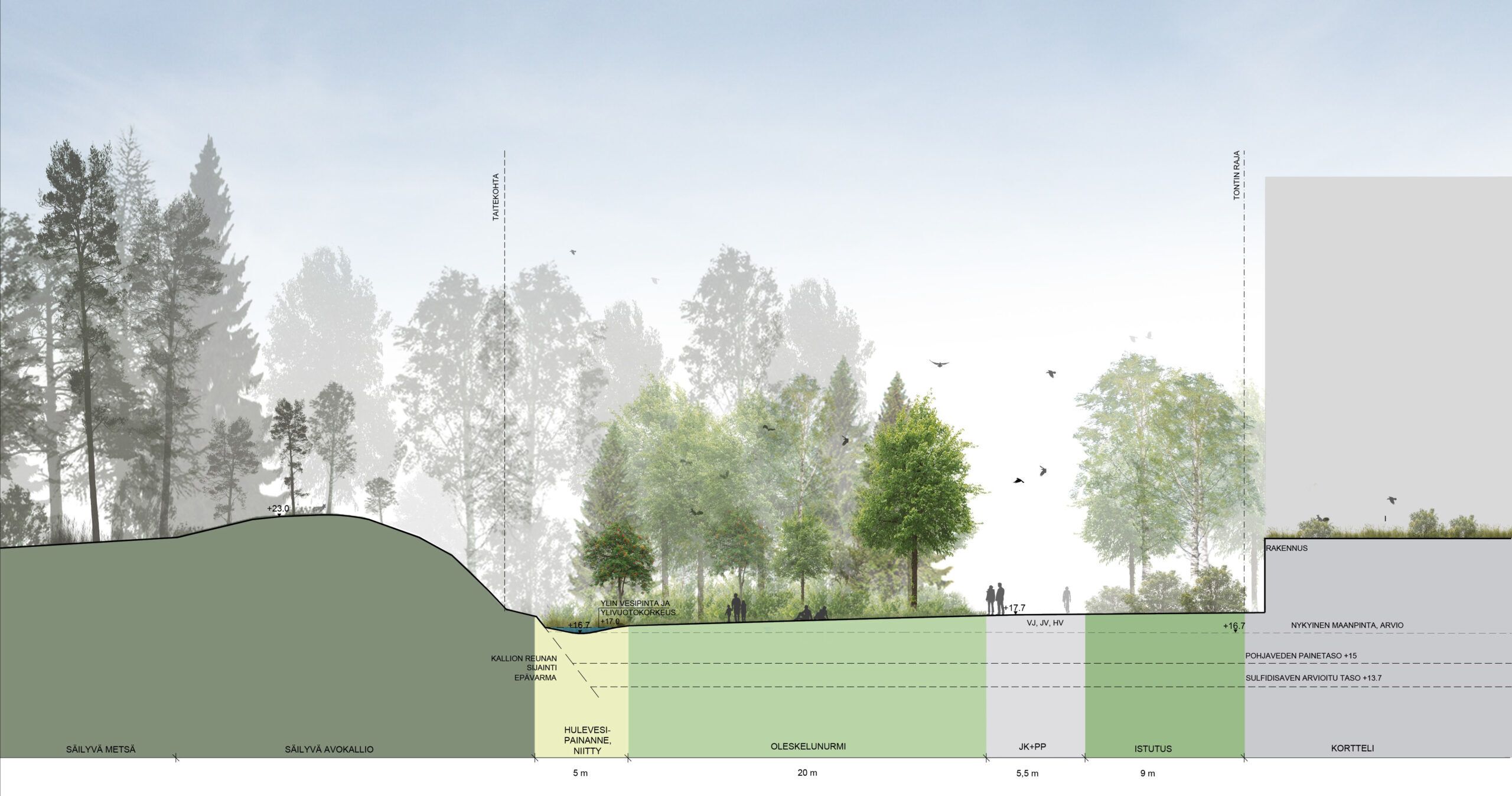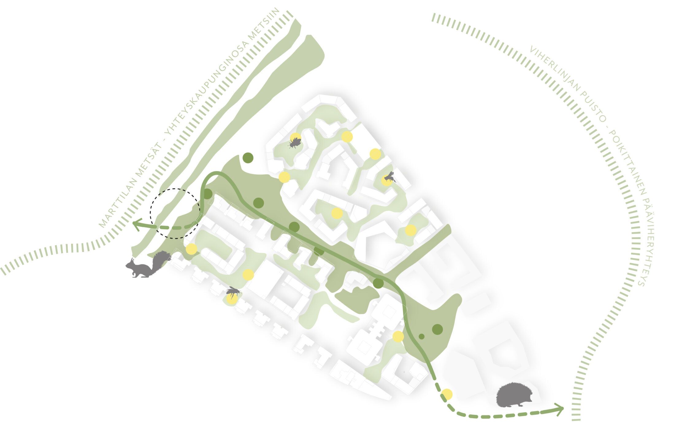 Valion alueen keskeinen tavoite on linkittää suunnittelualueen säilytettävät ja uudet viheralueet osaksi ympäröiviä ekologisia yhteyksiä. Mätäjoki on seudullisesti merkittävä vesistöalue, joka kärsii ajoittain tulvista, ja on myös taimenen elinaluetta. Alueella hulevesiä käsitellään määrällisesti ja laadullisesti Mätäjoen olosuhteiden parantamiseksi. Hulevesien käsittely tehdään luontopohjaisilla ratkaisuilla, jotka tuottavat myös muita hyötyjä alueen erilaisille toimijoille. Alueella säilytetään lisäksi mahdollisimman paljon nykyistä maaperää sekä suurta puustoa. Puistovyöhyke tarjoaa alueen tuleville asukkaille yhteyden laajempiin virkistysalueisiin.